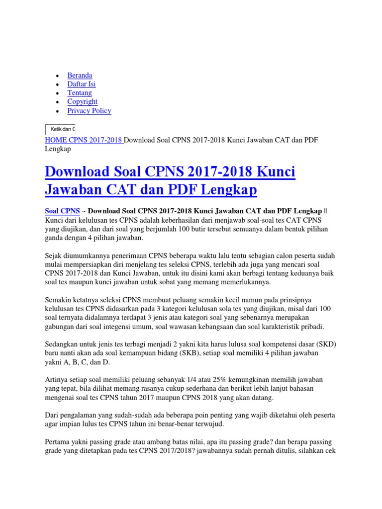 20210310 download soal cpns 2017 dan kunci jawaban pdfperlu dicatat bahwa penilaian tidak ada sistem pengurangan jika menjawab jawaban yang salah. Kisi kisi dan kumpulan soal tes cpns 2019 lengkap dengan kunci jawaban bisa download gratis dan nilai ambang batas resmi 4 views. Sejak diumumkannya penerimaan cpns beberapa waktu lalu tentu sebagian calon peserta sudah mulai mempersiapkan diri menjelang tes seleksi cpns, terlebih ada juga yang mencari soal cpns 2021/2022 dan kunci jawaban, untuk itu disini kami akan berbagi tentang keduanya baik soal tes maupun kunci jawaban untuk sobat yang memang memerlukannya. Di akhir artikel akan saya sediakan link. More images for kunci jawaban tes cpns 2017 »